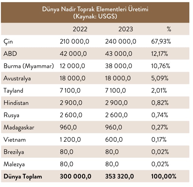 Nadir toprak elementleri üretim ve rezervleri Toplam Nadir Toprak Elementleri Oksit içeriği olarak raporlanmaktadır. Yani 100 milyon ton %5 Nadir toprak elementleri oksitlerinin toplamı tenör olarak veriliyorsa, bu 5 milyon ton TREO olarak rapor edilmektedir. Bu bağlamda TREO olarak Dünya maden üretimi ve rezervlerine bakacak olursak;.