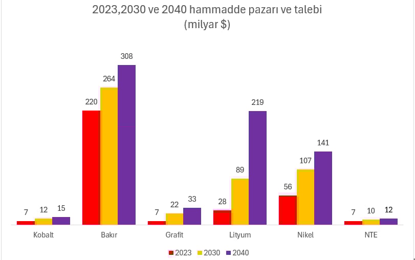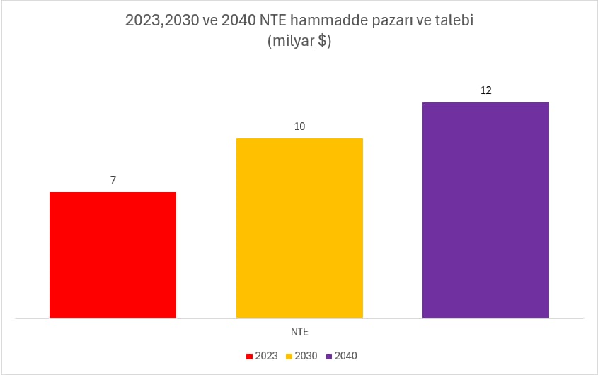 Görüleceği üzere aslında NTE Pazar büyüklüğü diğer kritik mineraller göz önüne alındığında oldukça küçük sayılabilir. Örneğin 2040’da lityum talebinin 190 milyar dolar civarında bir artış ile 219 milyar dolara çıkacağı öngörülmektidir (Canadian Critical Minerals Strategy Annual Report 2024). Dolayıs ile NTE üretimi uzun dönemli bir stratejinin parçası olarak katma değerli ürünlerin üretilmesini hedeflemediği durumlarda ekonomik olarak büyük fayda sağlayabilecek bir alan olamamaktadır.