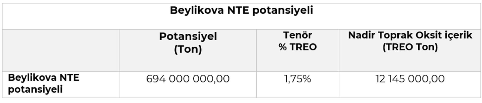 Bu yapılan çalışmaların tüm detayları açık olarak yayınlanmadığı için tenör ve diğer detayların tam olarak neler olduğu netlik göstermemekte. Basit bir hesaplama yapılacak olursa, 570 bin ton cevherin işlenmesi ile 10 bin ton nadir toprak oksidi eldesi düşünüldüğünde 10 000/570 000 =%1,75 gibi cevherin nadir toprak oksidi içeriği hesaplanabilir. Bu veriler baz alındığında da içirik olarak 12 milyon tonluk bir TREO kaynağından söz etmemiz mümkün olmakta.