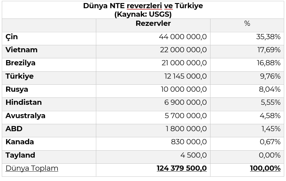 Ülkemizde ise Nadir toprak elementleri ilgili olarak bir MTA raporunda 1,348,898 ton % 99,5 Nadir Toprak Oksitleri içeriğine sahip potansiyelin belirlendiği bilgisine yer verilmiştir[i].